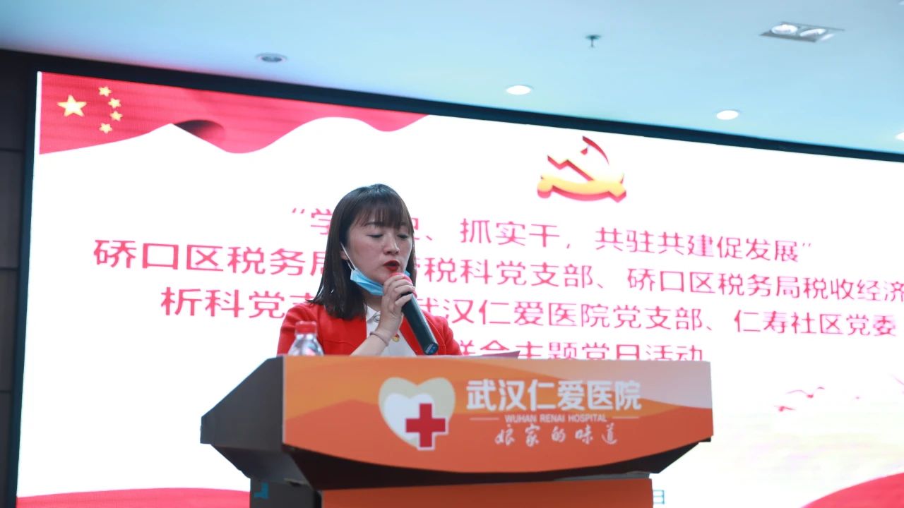 為迎接建黨100周年,進(jìn)一步發(fā)揮黨員先鋒模范作用,5月19日,武漢仁愛醫(yī)院黨支部聯(lián)合硚口區(qū)稅務(wù)局黨委、硚口區(qū)稅務(wù)局貨勞稅科黨支部、硚口區(qū)稅務(wù)局稅收經(jīng)濟(jì)分析科黨支部、仁壽社區(qū)黨委舉辦了“學(xué)黨史、抓實(shí)干,共駐共建促發(fā)展”的主題黨日活動。