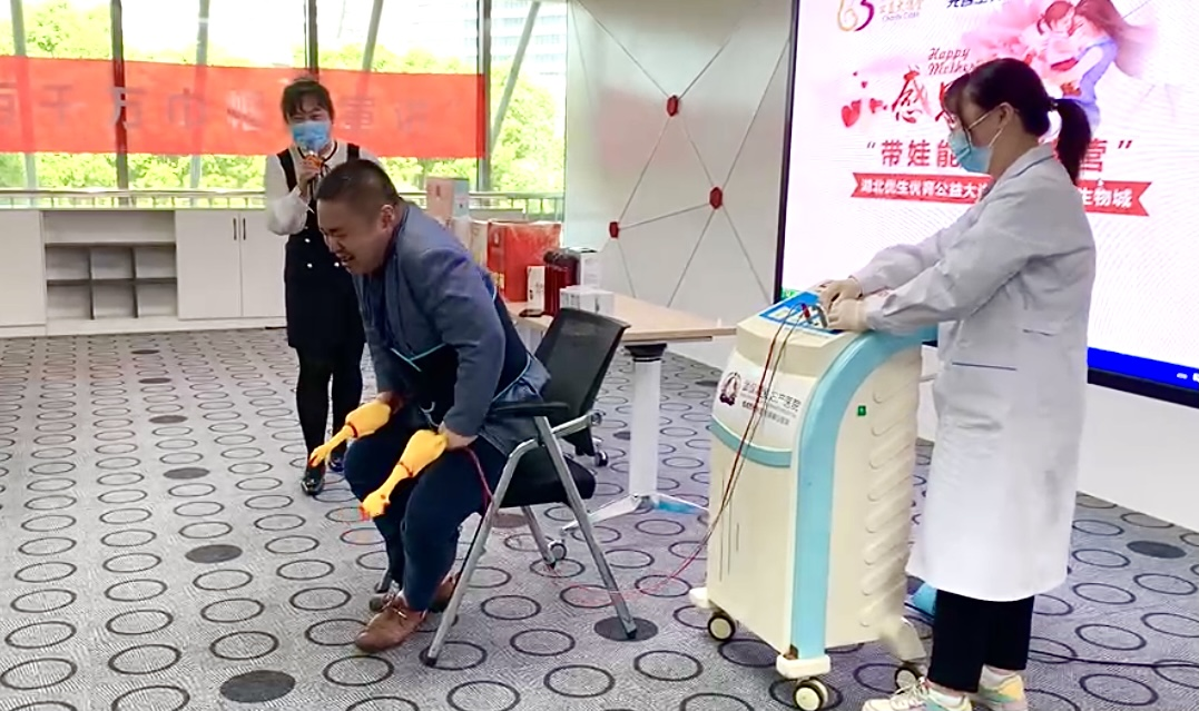 而“分娩吧爸爸”——分娩陣痛大挑戰(zhàn),則燃爆全場,掀起了活動高潮。男員工在臺上嗷嗷大叫,女員工在臺下哈哈大笑?;顒釉硎峭ㄟ^電脈沖對人體進(jìn)行電刺激,來模擬產(chǎn)婦分娩的疼痛感,疼痛共分10 級,指數(shù)逐級遞增。“哎呀……受不了啦!”“6級,停!停!停!……”從參加體驗?zāi)袉T工的“表情包”,可以想象出生孩子大概是這樣的:痛不欲生、撕心裂肺、大喊大叫、大汗淋漓……體驗者感慨,做母親太不容易了,要好好工作,好好愛家人。